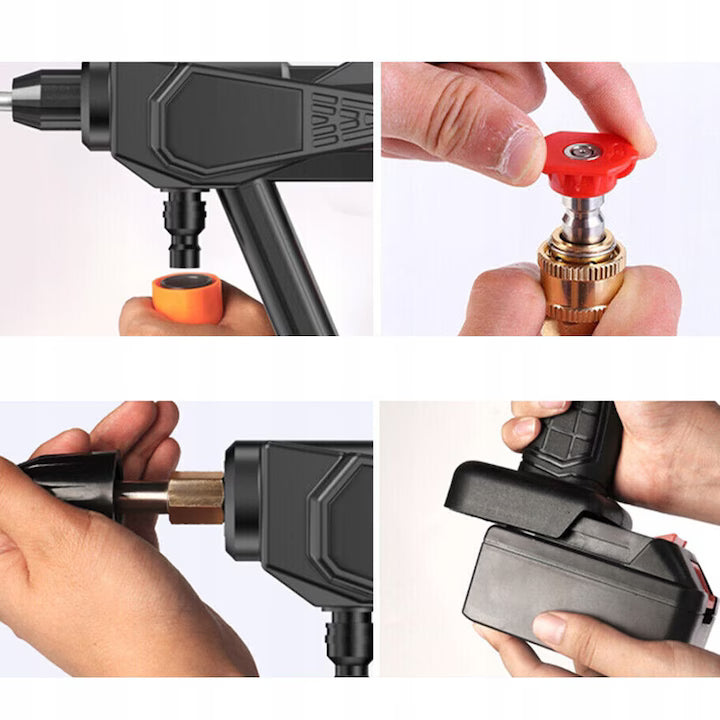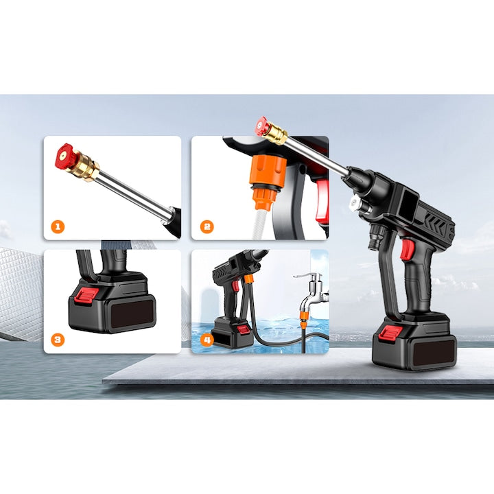 Aparatul de spălat cu presiune portabil este o unealtă fără fir, alimentată de acumulatori de 48V, destinată curățării vehiculelor, teraselor, uneltelor de grădină și a altor suprafețe. Sistemul este auto-amorsant, permițând extragerea apei din surse alternative, precum găleți sau alte recipiente, prin intermediul furtunului de 5 metri inclus.