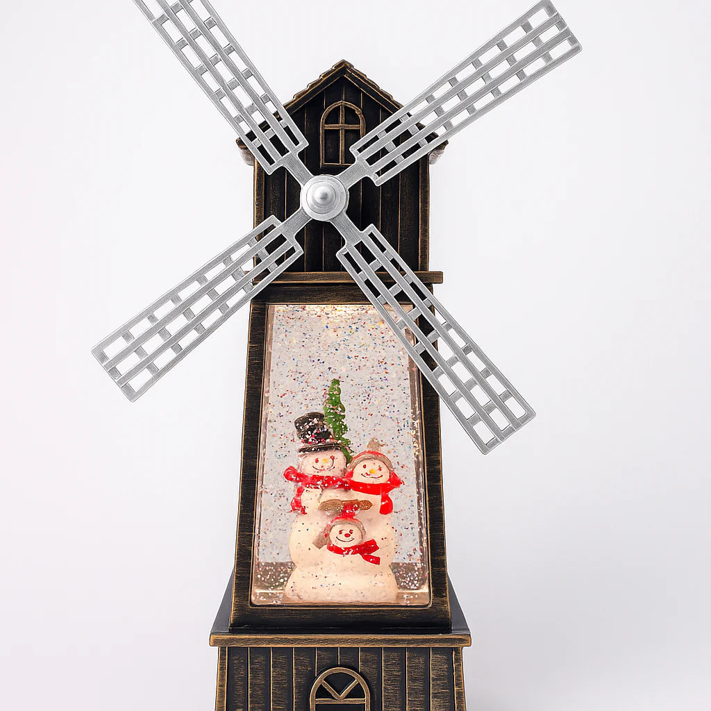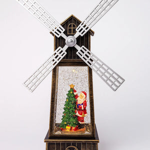 În interiorul morii se află o scenă festivă cu Moș Crăciun, pusă în valoare de efectul de ninsoare continuă, generat de un ventilator intern. Particulele sclipitoare plutesc neîntrerupt, creând un spectacol vizual ca într-un glob de zăpadă de lux. Decorul este completat de iluminare LED discretă și de funcția muzicală, care redă colinde clasice de Crăciun.