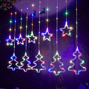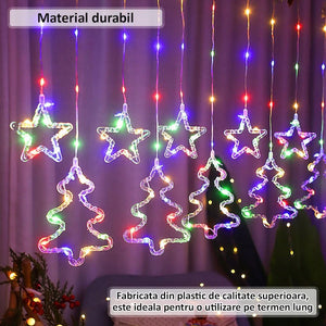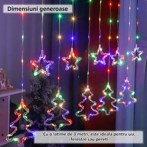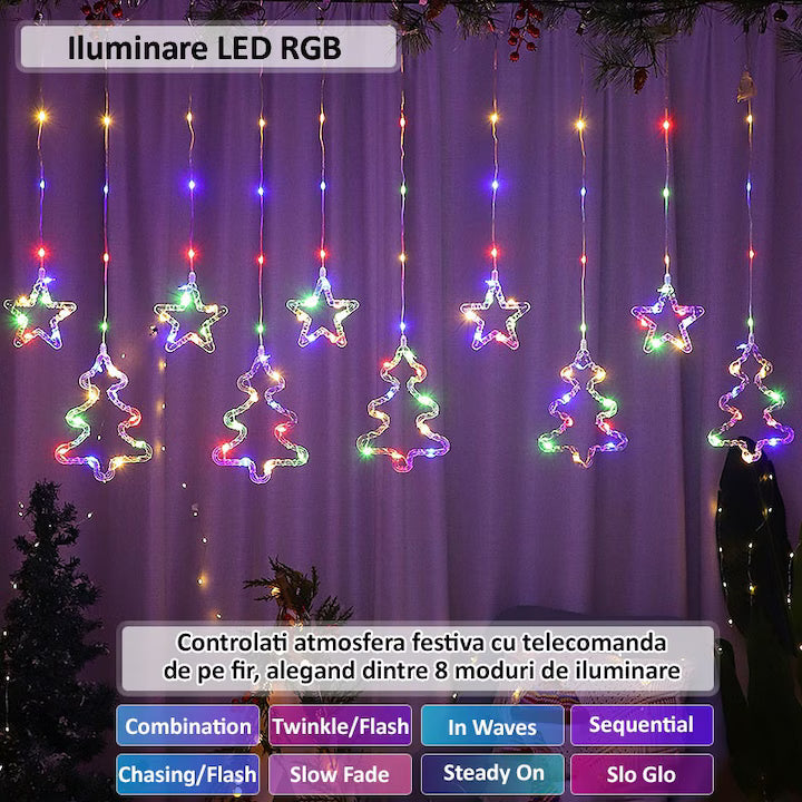 Instalație Crăciun tip Perdea, LED RGB Multicolor, 3m, 8 Jocuri de Lumină, Interconectabilă, Stele și Brazi, Telecomandă pe Fir