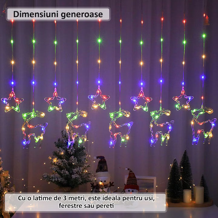Instalație de Crăciun tip Perdea, LED RGB Multicolor, 3m, Interconectabilă, 8 Jocuri de Lumină, Stele și Reni