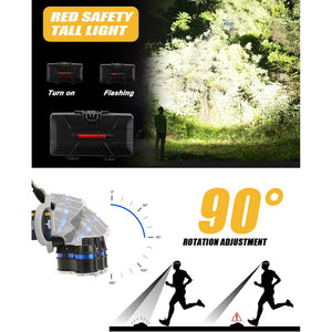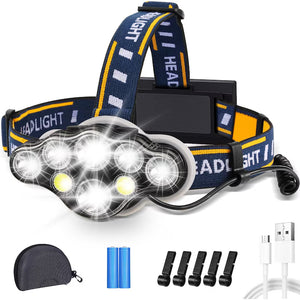 Lanternă Frontală 8 LED, 18.000 Lumeni, 2 Acumulatori, Rotire 90°, Încărcare USB, IPX5