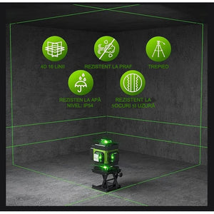 Nivela Laser 4D cu 16 Linii – Autonivelare, Telecomandă, Lumină Verde și Trepied Inclus | Laser Profesional pentru Construcții și Amenajări