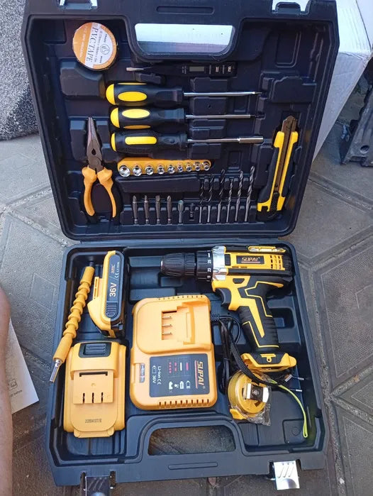 Mașina de găurit și înșurubat cu funcție de percuție este o sculă electrică portabilă, alimentată de acumulatori de 48V, proiectată pentru diverse aplicații în construcții și bricolaj. Setul este livrat într-o valiză de transport și include doi acumulatori, un încărcător și un set de 30 de accesorii.