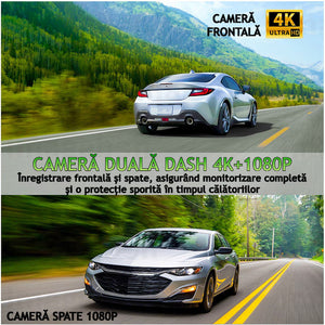 Cameră Față 4K: Înregistrează la rezoluție Ultra HD, cu unghi reglabil pe verticală.