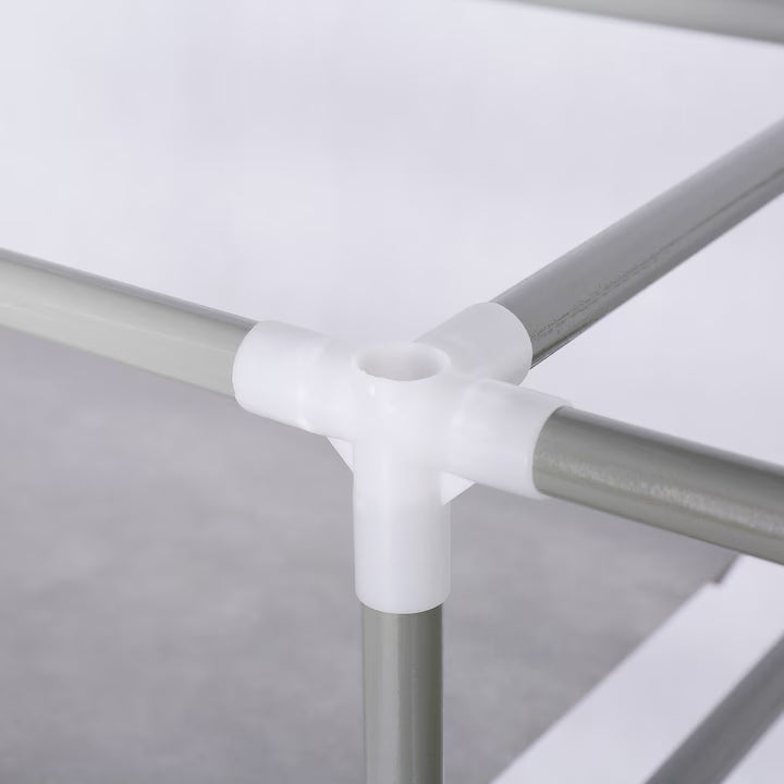 Structura este realizată din țevi metalice și conectori din plastic, iar asamblarea se face prin îmbinarea componentelor, fără a necesita unelte suplimentare.