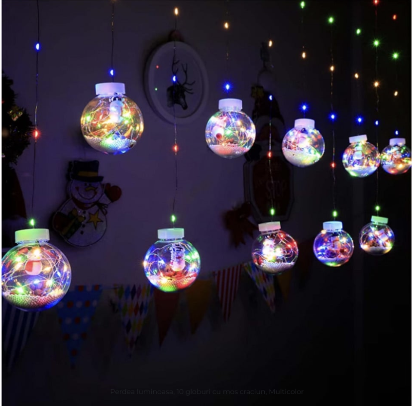 Adaugă un farmec de poveste sărbătorilor cu această perdea luminoasă de Crăciun cu 10 globuri decorative Moș Crăciun, concepută pentru a crea o atmosferă caldă, veselă și festivă în orice locuință. Fiecare glob este echipat cu LED-uri multicolore, oferind o lumină intensă și plăcută, ideală pentru decorarea ferestrelor, holurilor, vitrinelor sau spațiilor tematice.