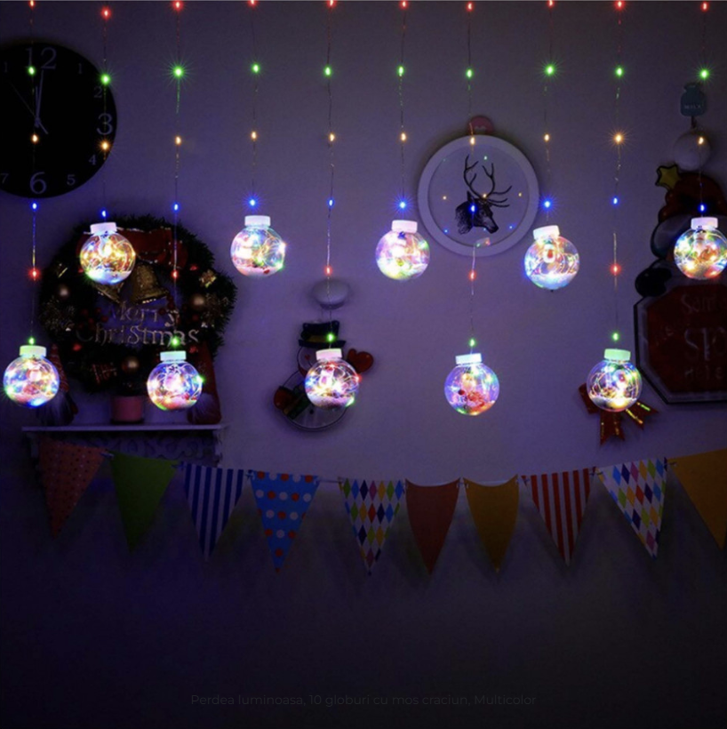 Perdea Luminoasă de Crăciun, 10 Globuri cu Moș Crăciun, 3m, LED Multicolor, 8 Jocuri de Lumină