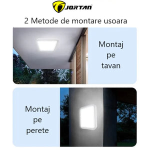 Plafonieră LED JORTAN® cu Încărcare Solară, 300W, Panou Solar Separat, Telecomandă, Formă Pătrată 37.8 cm, Lumină Alb Rece 6500K, Autonomie 12h, IP44
