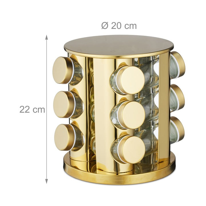 Set de 12 Recipiente pentru Condimente cu Suport Rotativ, Oțel și Sticlă, Auriu/Transparent