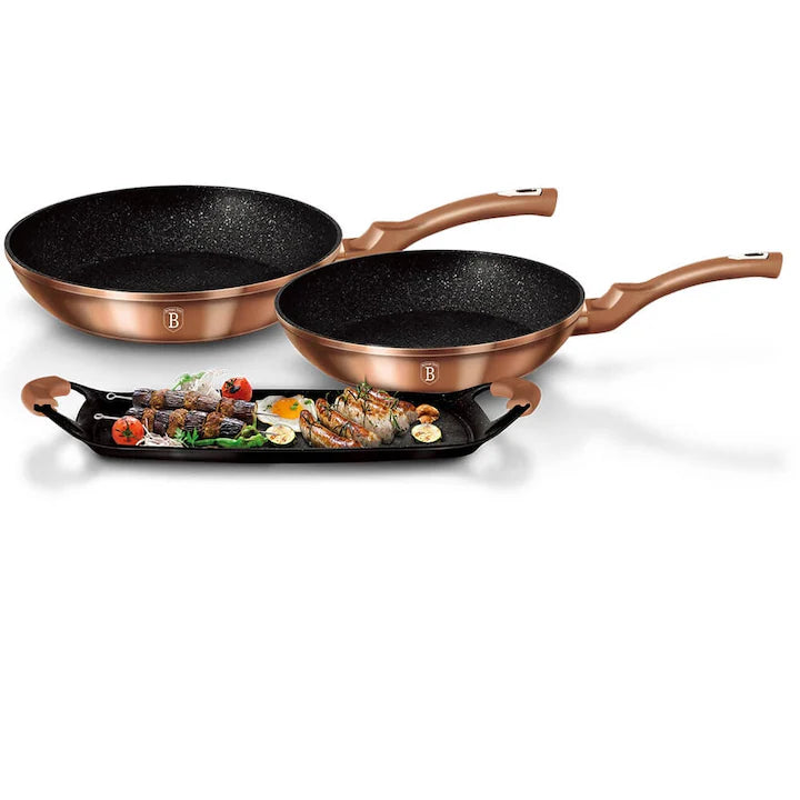 Set 2 Tigai (22/26 cm) si Placa Grill (36x23 cm), Aluminiu Forjat, 3 Straturi Marmura, Inductie, Auriu Rose