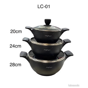 Setul include trei dimensiuni versatile (20 cm, 24 cm și 28 cm), perfecte pentru supe, tocănițe, sosuri sau feluri principale.