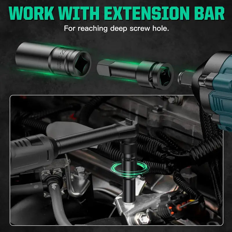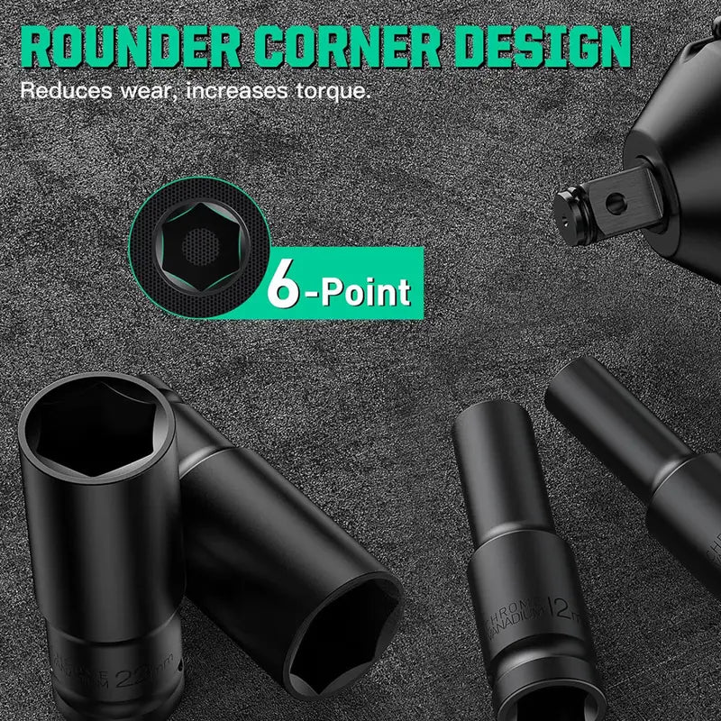 Acest set conține 9 chei tubulare metrice de impact cu pătrat de antrenare de 1/2 inch. Fabricate din oțel Crom-Molibden (Cr-Mo), acestea sunt proiectate pentru a fi utilizate cu mașini de înșurubat cu impact, pistoale pneumatice și chei dinamometrice de mare putere, fiind adecvate pentru service-uri auto, ateliere de vulcanizare și medii industriale.