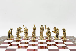Set Sah de Lux Tematica Imperiul Roman, Piese Metalice, Tabla Lemn Masiv 32 cm, Lucrat Manual, Cutie Depozitare