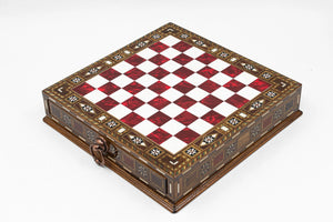 Tabla de sah este realizata din lemn nobil (Nuc si Lemn de Trandafir), avand o inaltime de 6 cm care permite depozitarea pieselor in interior. Piesele de sah sunt realizate din metal, avand o greutate consistenta (aprox. 1 kg total) si sunt sculptate complex pentru a reprezenta figuri iconice: imparati puternici, centurioni fiorosi si legionari romani. ⚔️