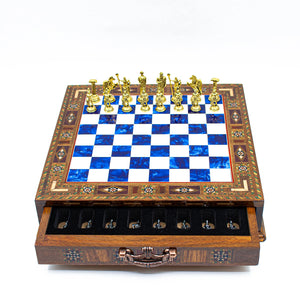 Tabla de sah este realizata din lemn nobil (Nuc si Lemn de Trandafir), avand o inaltime de 6 cm care permite depozitarea pieselor in interior. Piesele de sah sunt realizate din metal, avand o greutate consistenta (aprox. 1 kg total) si sunt sculptate complex pentru a reprezenta figuri iconice: imparati puternici, centurioni fiorosi si legionari romani. ⚔️