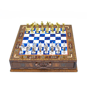 Acasă Set Sah de Lux Tematica Imperiul Roman, Piese Metalice, Tabla Lemn Masiv 32 cm, Lucrat Manual, Cutie Depozitare