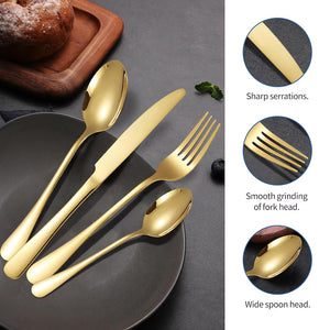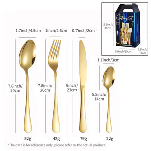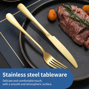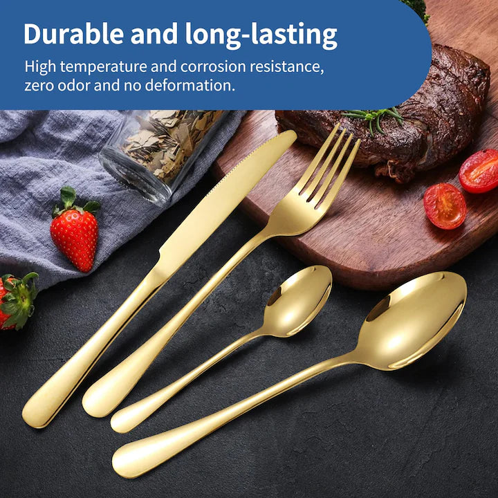 Setul de tacâmuri PHIKER distribuit de Visivo include 24 de piese din oțel inoxidabil: furculițe, linguri, cuțite și lingurițe. Tacâmurile au finisaj galvanizat auriu și negru, rezistent la rugină și uzură. Designul cu suprafață lucioasă tip oglindă și mâner gros asigură utilizare practică și confortabilă. Potrivite pentru utilizare zilnică sau în restaurante și hoteluri.