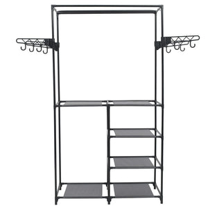 Stand pentru Haine și Pantofi, Cadru Metalic, 4 Rafturi Textile, Cârlige Laterale