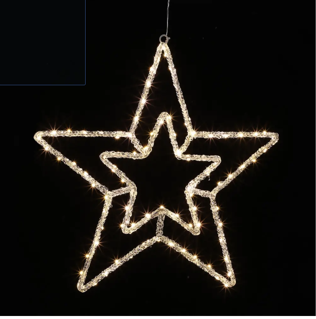 Adaugă o notă elegantă și festivă decorului tău cu această stea decorativă 2D concentrică din acril, cu diametrul de 50 cm, iluminată cu LED-uri în nuanță Alb Cald. Designul său modern și forma dublă concentrică creează un efect vizual spectaculos, perfect pentru decorul de Crăciun sau pentru ambientarea spațiilor interioare și exterioare protejate.