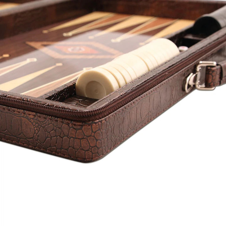 Set de table Diplomat, lucrat manual din piele și lemn masiv. Include tablă pliabilă, piese de joc complete și zaruri. Construcția îmbină pielea naturală cu lemnul pentru o rezistență îndelungată și o prezentare distinctă.