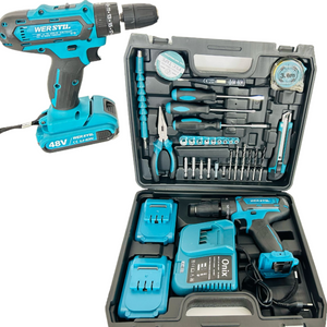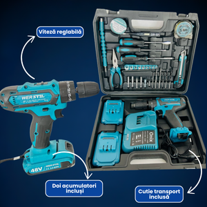 Bormașină / Autofiletantă cu Percuție, Fără Fir, 48V, cu 2 Acumulatori și Trusă de 36 Accesorii