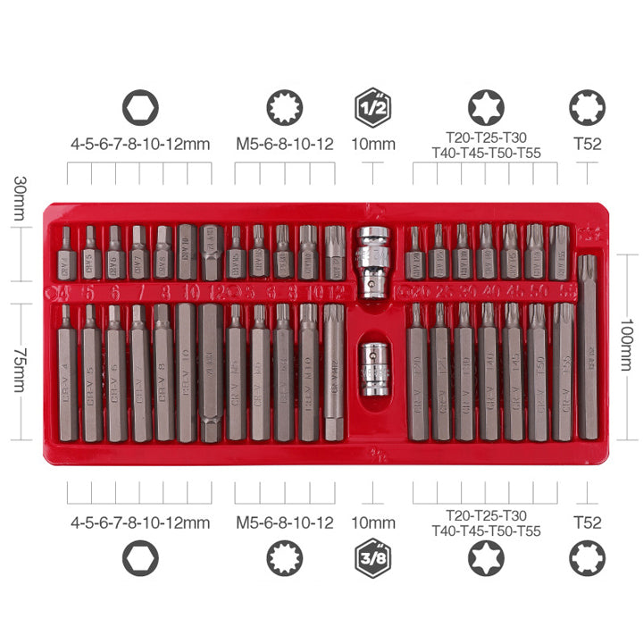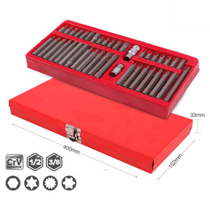 Trusă 41 Piese Biți Chei Torx, Hex, Spline | Set Scurt și Lung cu Adaptoare 1/2" și 3/8"